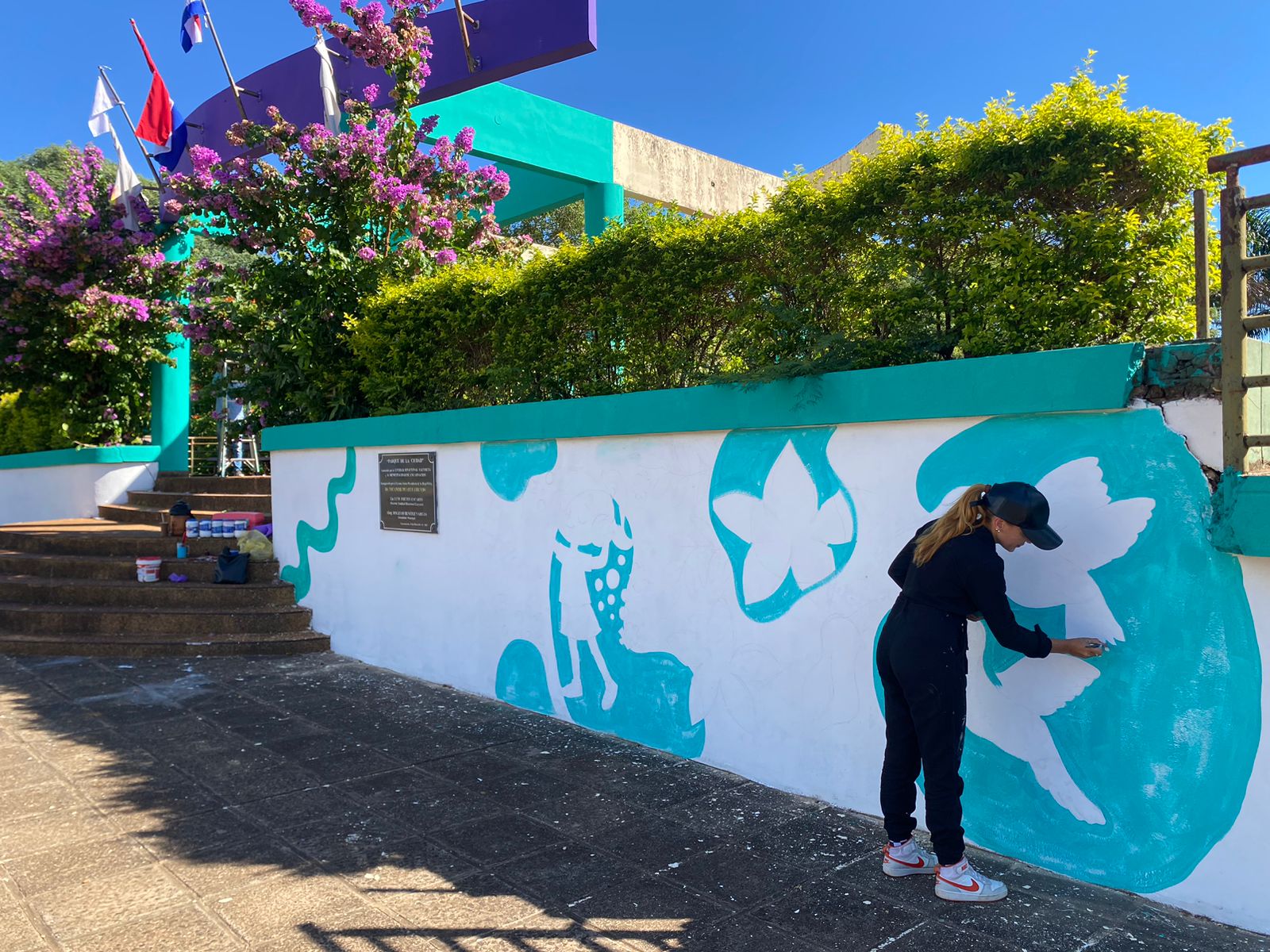 En medio del movimiento habitual de este viernes, una escena distinta captó la atención en uno de los accesos principales de los espacios recreativos de Encarnación: una artista, concentrada y apasionada, daba vida a una obra que ya comienza a transformar el paisaje urbano.